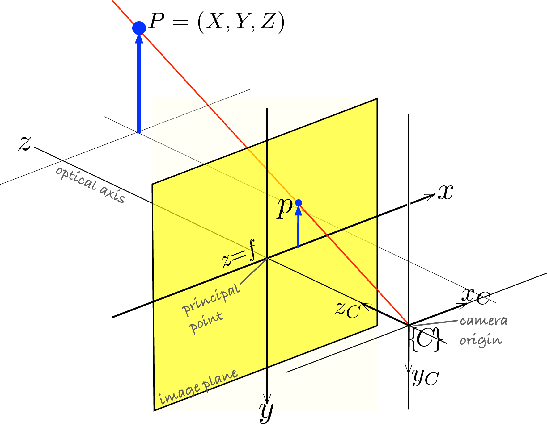 With the origin of the image coordinate system, \((x, y)\), in the center of the image, the perspective projection equation relates the world locations to image locations.