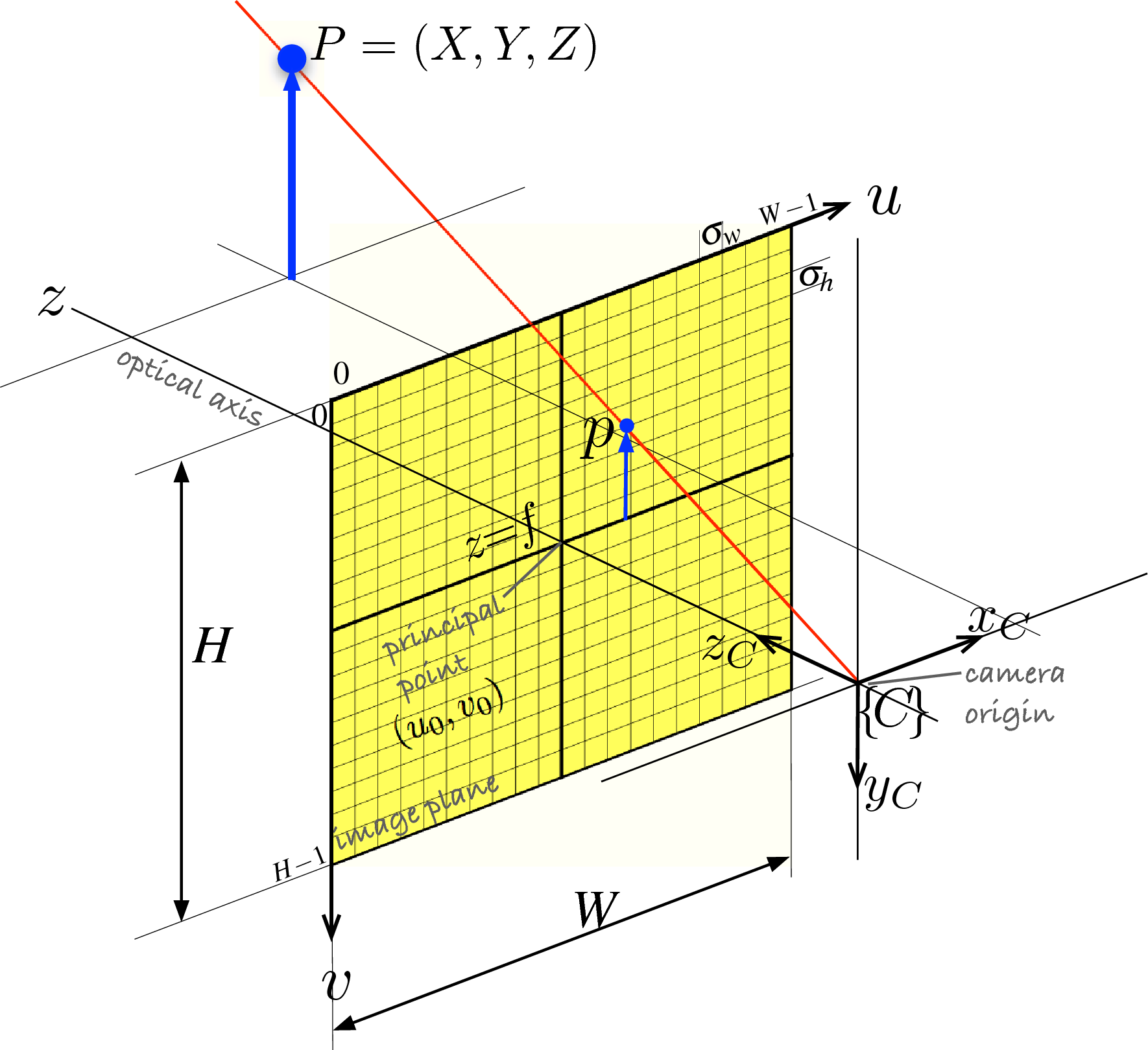 The \(u_0\) and \(v_0\) terms allow us to use the upper right corner of the image as the origin. The coordinates of a point \((u, v)\) is again found by converting from homogeneos coordinates to Euclidean coordinates, \(\left(\frac{wu}{w}, \frac{wv}{w}\right)\).