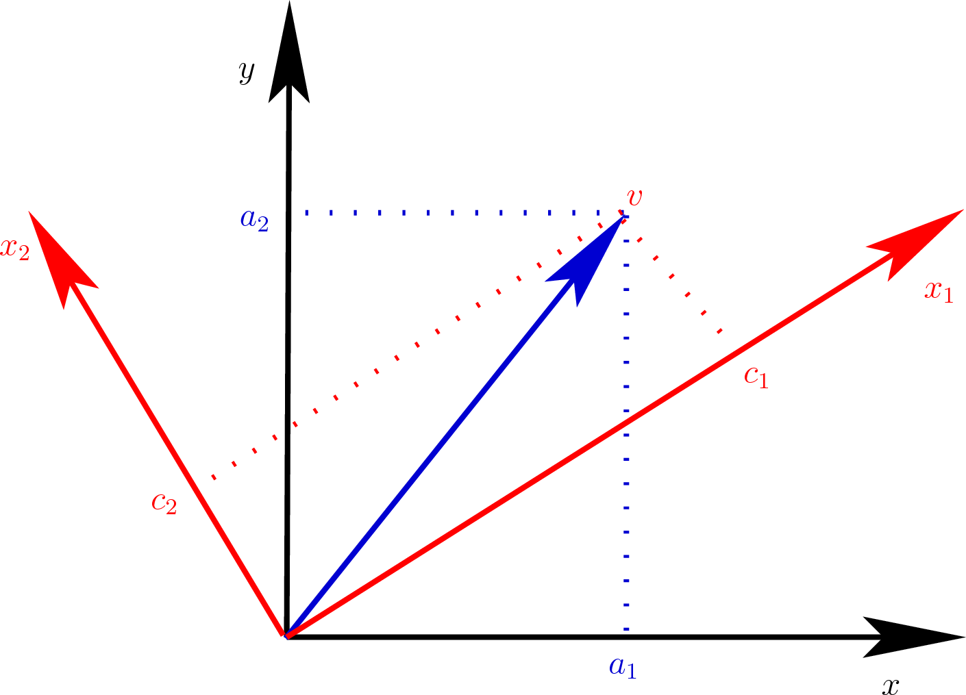 We call the procedure a change of basis because, as shown in figure Fig. 4.3, we use the eigenvectors as a new coordinate frame to describe the vector instead of the normal Cartesian basis vectors.
