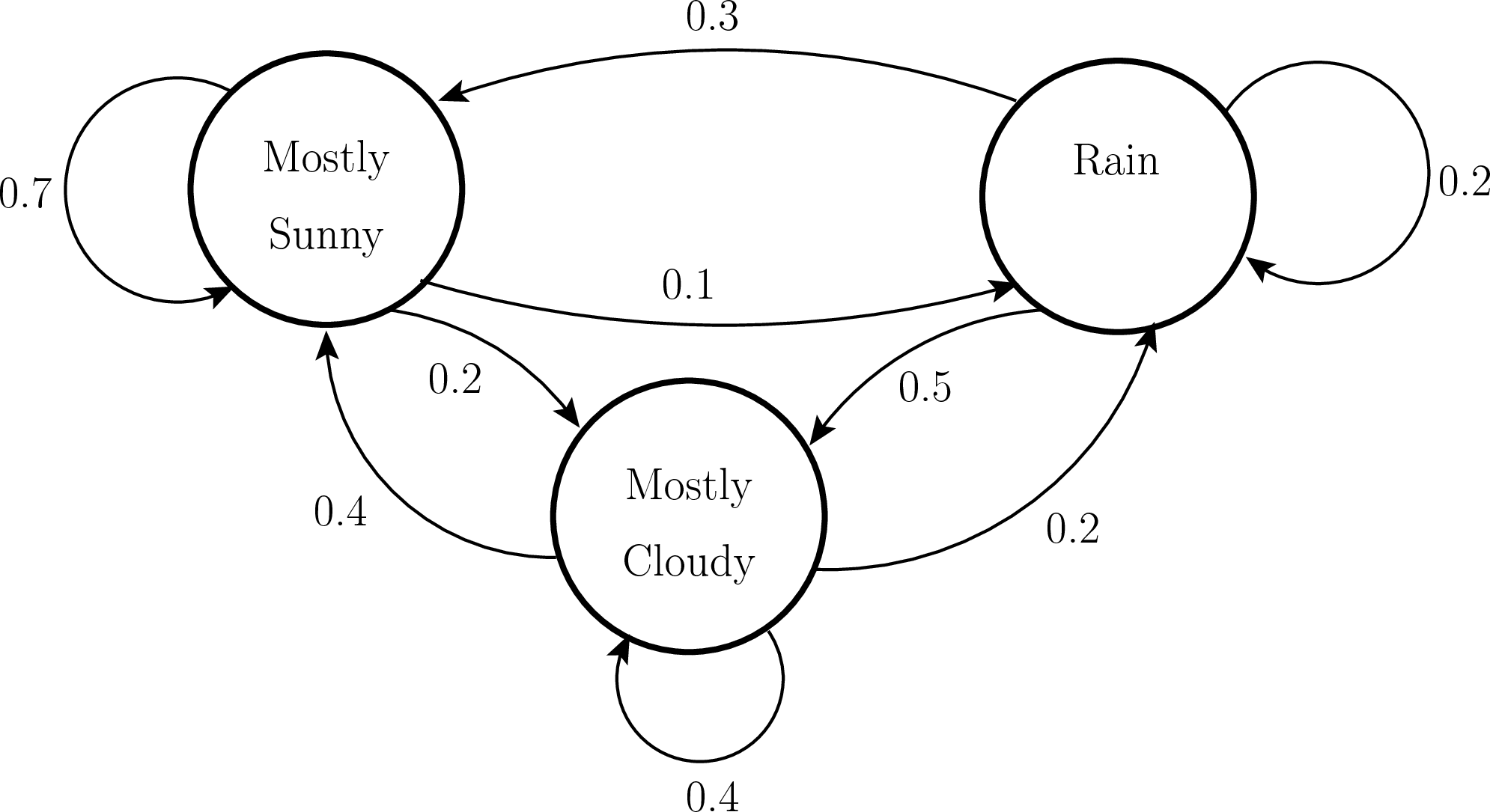 We interpret the FSM diagram to say that if it is sunny today, there is a 70% chance that it will also be sunny tomorrow, a 20% chance that it will be cloudy tomorrow, and a 10% chance of rain tomorrow. Similarly, we can assign probabilities for tomorrow’s weather based on whether it is cloudy or raining today.