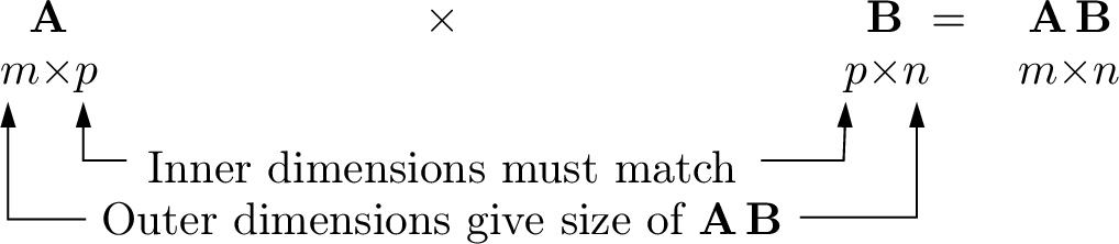 Inner products find the elements of a matrix product. To complete the inner products, the number of columns in the left matrix must match the number of rows in the right matrix. We say that the inner dimensions of the two matrices must agree. As shown in Table 2.1, A \(m{\times}p\) matrix may be multiplied by a \(p{\times}n\) matrix to yield a \(m{\times}n\) matrix. The size of the product matrix is the outer dimensions of the matrices.