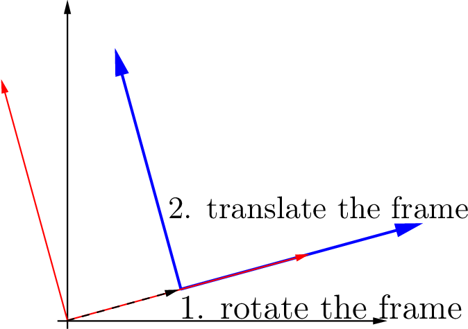 Transformations of coordinate frames work differently from transformations of points. As shown in figure Fig. 2.15, each coordinate frame transformation starts with a rotation of the frame and then a translation relative to the rotated frame. Building a compound coordinate frame describing one frame relative to another, as shown in figure Fig. 2.16 and figure Fig. 2.17, requires a sequence of matrix multiplications. We start with the previous coordinate frame and multiply each sequential transform matrix until we reach the desired coordinate frame position. We write the order of transformation multiplications from left to right.