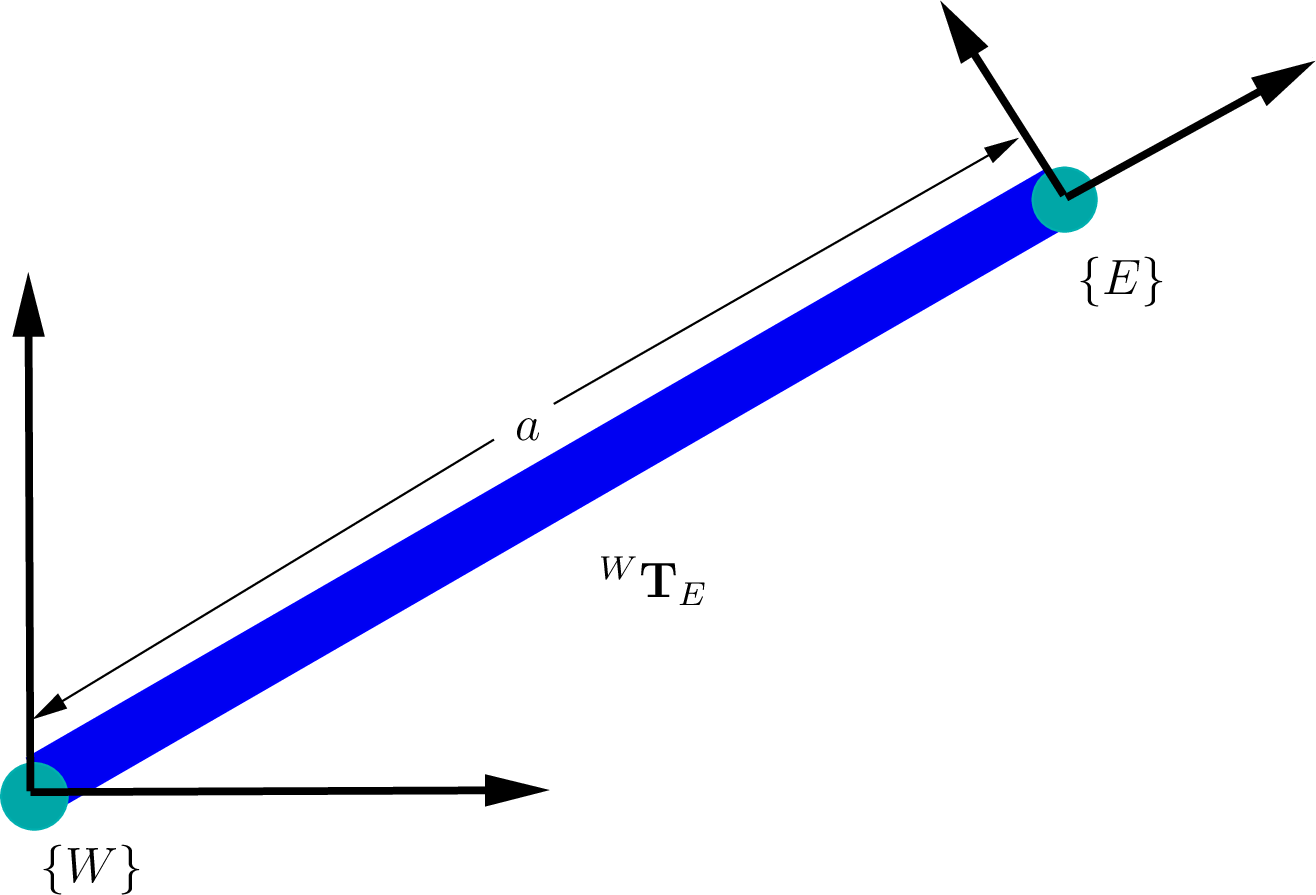 Fig. 2.16 The pose of the coordinate frame represents the end effector \(\{E\}\), which is defined relative to the world frame by the homogeneous coordinate transformation \({}^W\mathbf{T}_E = \mathbf{R}(\theta) \mathbf{Tx}(a)\).¶