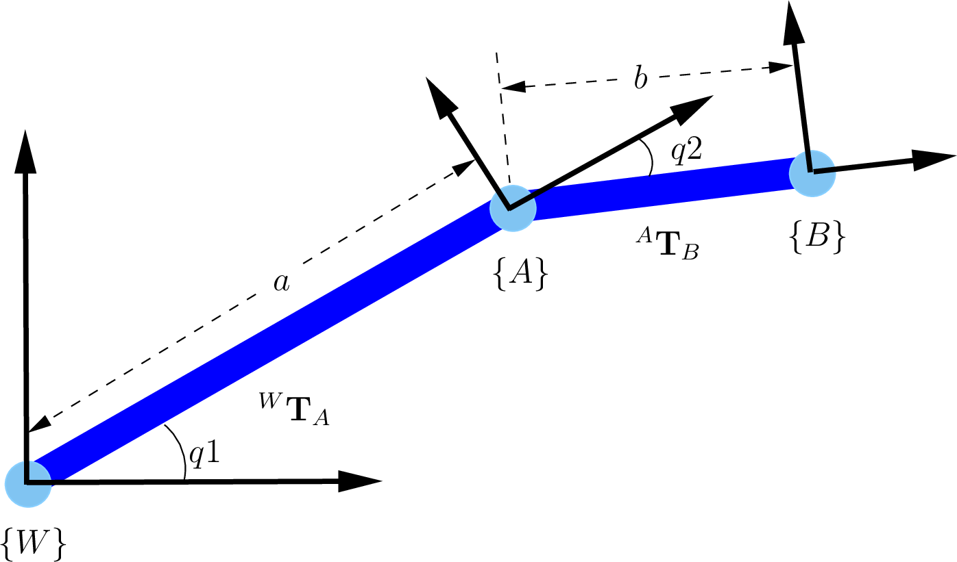 We transform coordinate frames to specify the locations of points relative to different coordinate frames. For example, we might know the location of an object in the world coordinate frame (\(\{W\}\)), but we need to know its location relative to coordinate frame \(\{B\}\), which is the end effector of the two-arm serial-link object shown in Fig. 2.17. If we have a camera at the location and orientation of \(\{B\}\), then we might need to map the location of objects to and from the world coordinate frame and the \(\{B\}\) coordinate frame.
