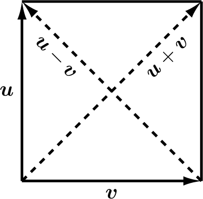 With reference to figure Fig. 2.6, we want to show that \(\norm{\bm{u} + \bm{v}} = \norm{\bm{u} - \bm{v}}\). The dot product of a vector with itself gives the length squared, which, if equivalent, proves that the lengths are equivalent. Recall that \(\bm{u}^T\bm{v}\) and \(\bm{v}^T\bm{u}\) are equal scalar values.