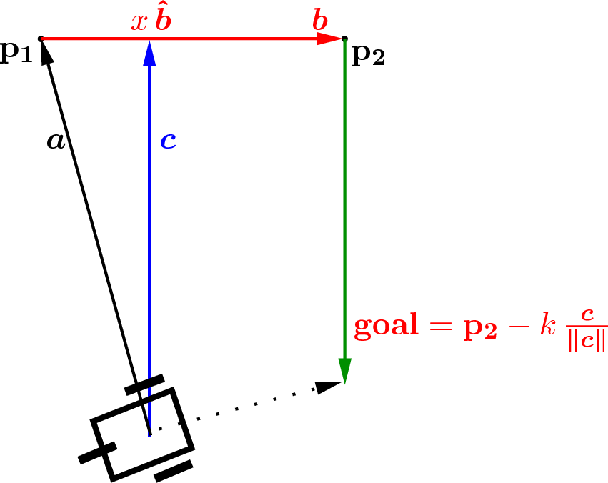 Fig. 2.7 Finding vector \(\bm{c}\) perpendicular to the wall, \(\bm{b}\), is needed to find the wall–following goal location.¶