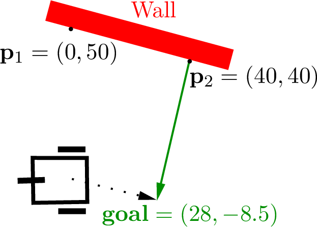 Figure Fig. 2.8 shows an example starting with the sensor measurements for points \(\mathbf{p}_1\) and \(\mathbf{p}_2\). Finding the vector \(\bm{c}\) perpendicular to the wall with equation (2.6) makes finding the short-term goal location quite simple. We are using sensors on the robot at \(\pm 90^{\circ}\) and \(\pm 45^{\circ}\), and the coordinate frame is that of the robot’s, so \(\mathbf{p}_1\) is on the \(y\) axis and \(\mathbf{p}_2\) is on a line at \(\pm 45^{\circ}\) from the robot. The robot begins 50 cm from the wall.