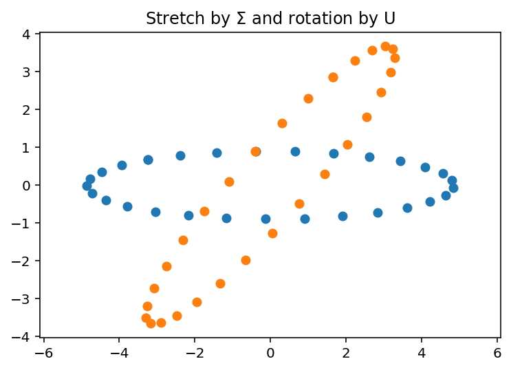 Fig. 5.5 When each point is multiplied by \(\mathbf{\Sigma}\), the points around the circle are moved out from the center to form an ellipse. Then the ellipse is rotated when the points are multiplied by \(\bf{U}\).¶